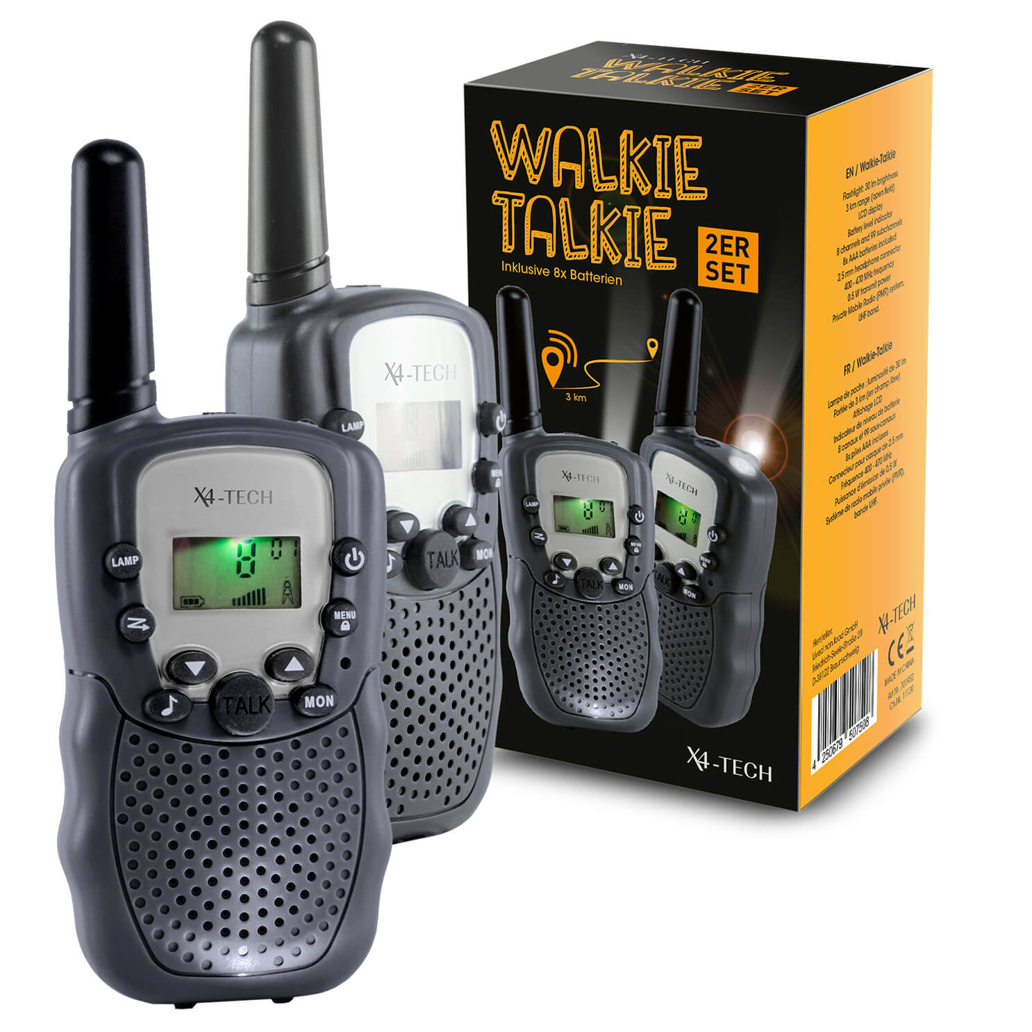 X4-TECH Walkie-Talkie mit 3 km Reichweite, 8 Kanälen, LCD-Display, LED-Licht und Kopfhöreranschluss perfekt für Outdoor-Abenteuer, schwarz