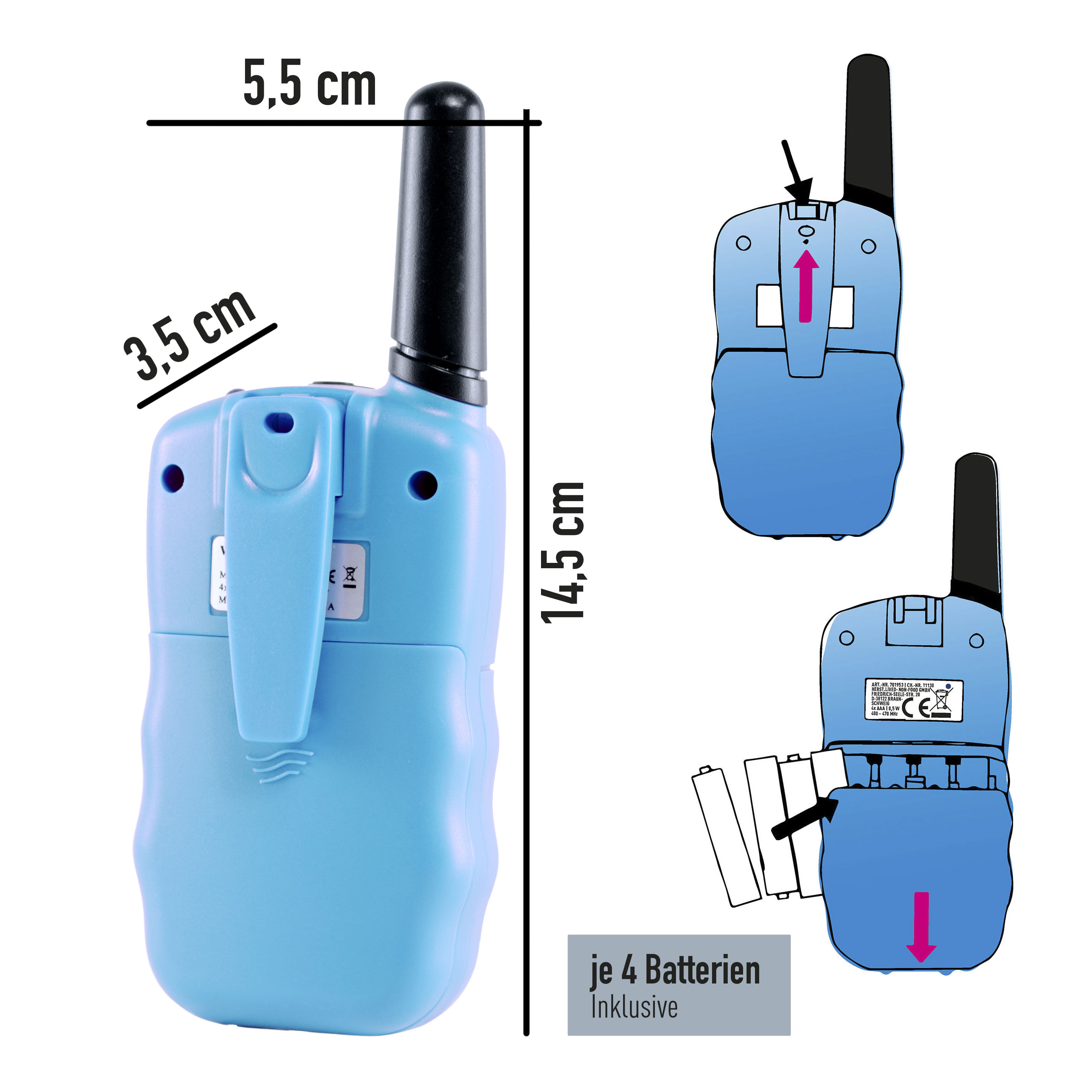 Das Walkie-Talkie ist sehr kompakt und leicht, nur 104 g schwer und in handlicher Größe, so dass es für jedes Kinderalter geeignet ist. Es wird mit 4x AAA Batterien betrieben, die im Lieferumfang enthalten sind, um eine lange Betriebsdauer zu gewährleisten.