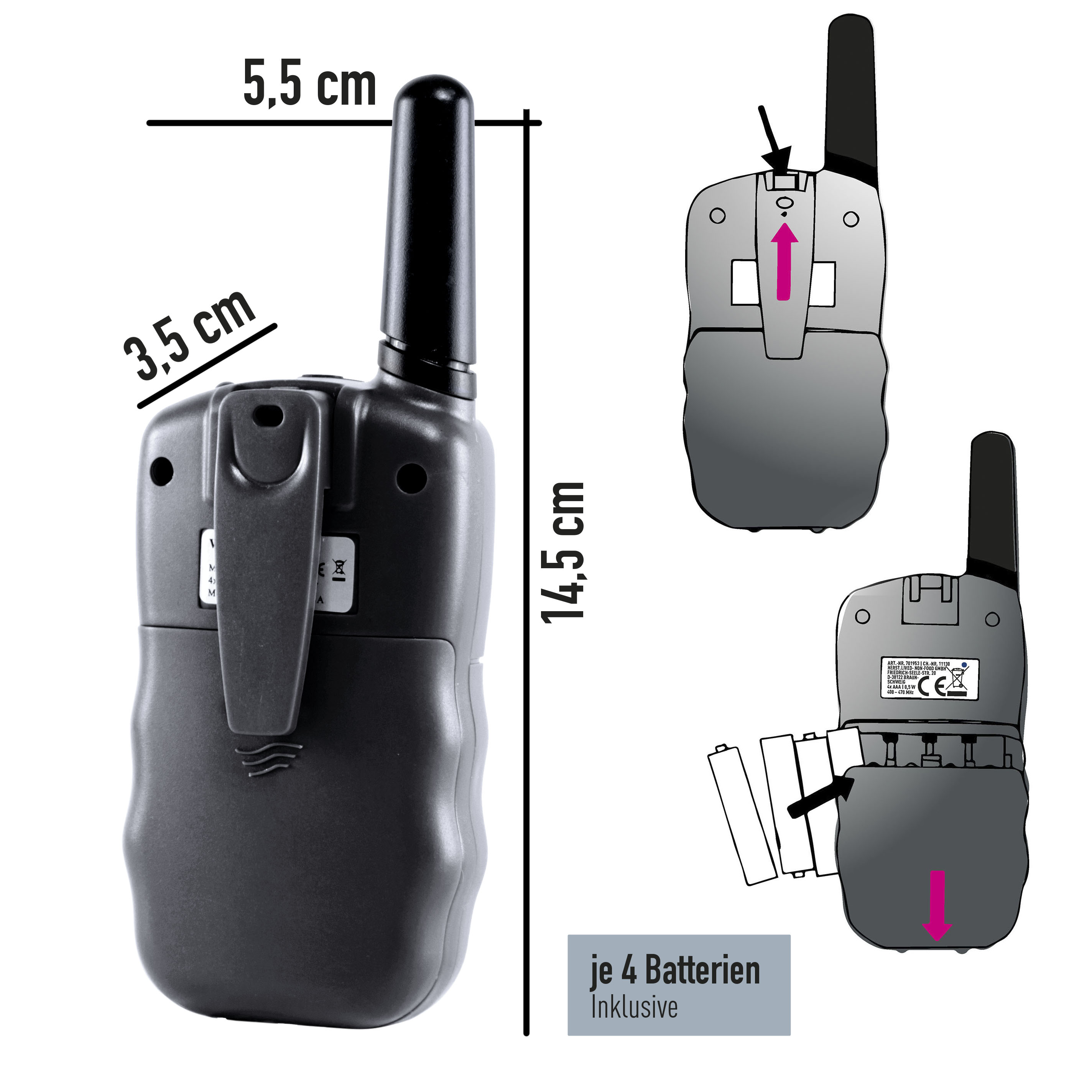 Das Walkie-Talkie ist sehr kompakt und leicht, nur 104 g schwer und in handlicher Größe, so dass es für jedes Kinderalter geeignet ist. Es wird mit 4x AAA Batterien betrieben, die im Lieferumfang enthalten sind, um eine lange Betriebsdauer zu gewährleisten.