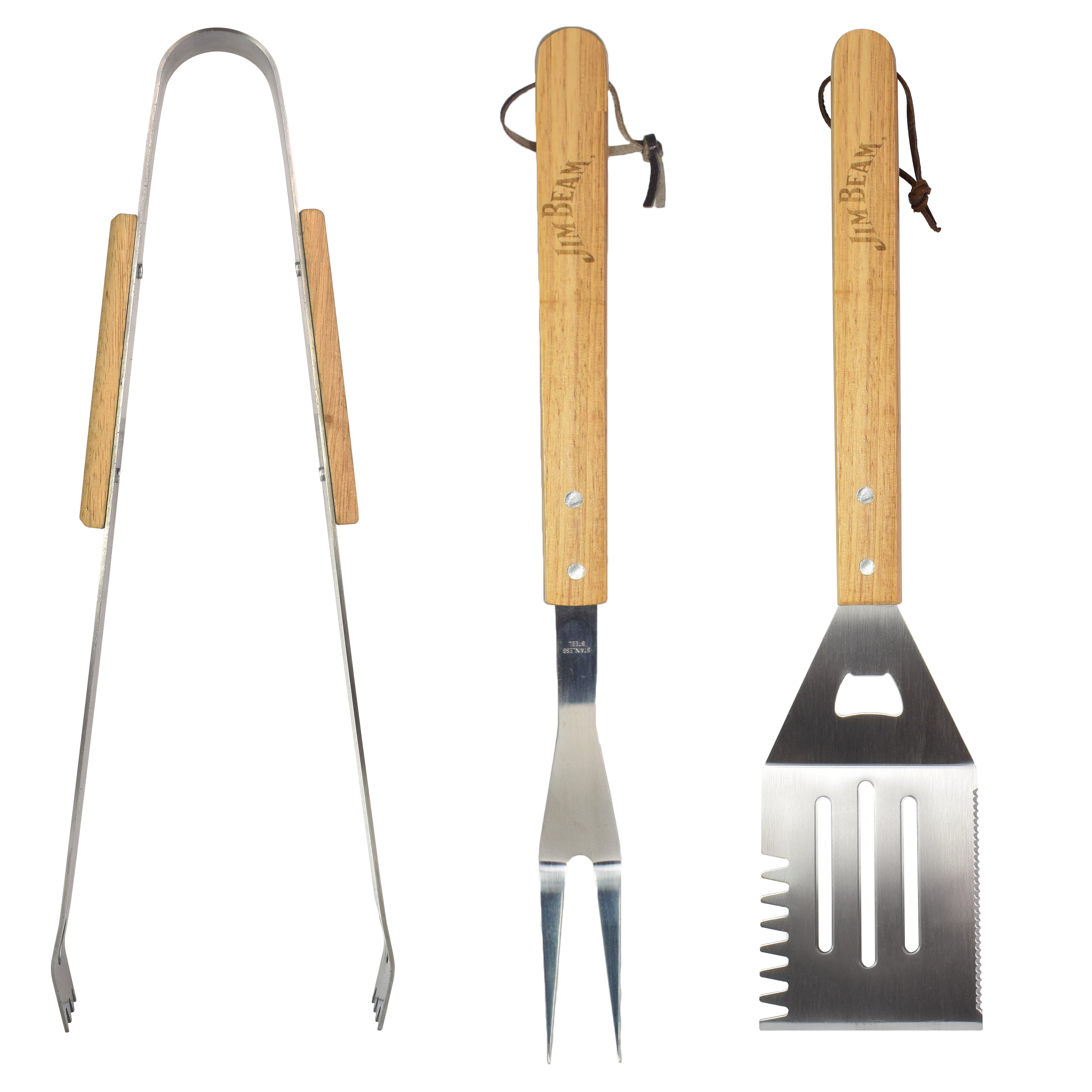 Produktinformationen "Jim Beam BBQ Werkzeug 3-teilig (Grillgabel, Grillwender, Grillzange) Grillbesteck, rostfreier Edelstahl, Holzgriff, BBQ-Set, Flaschenöffner, Für die Küche und den Grill"