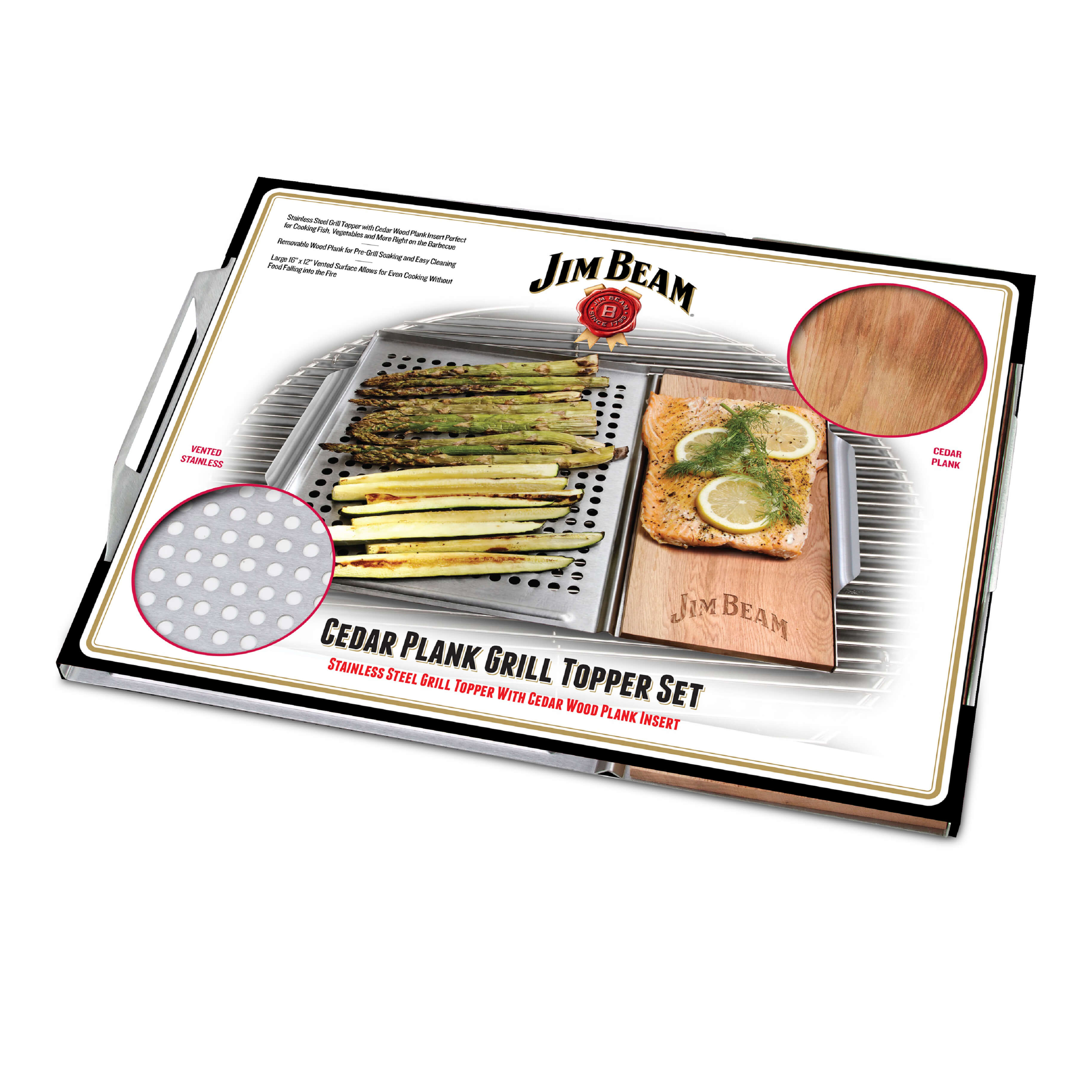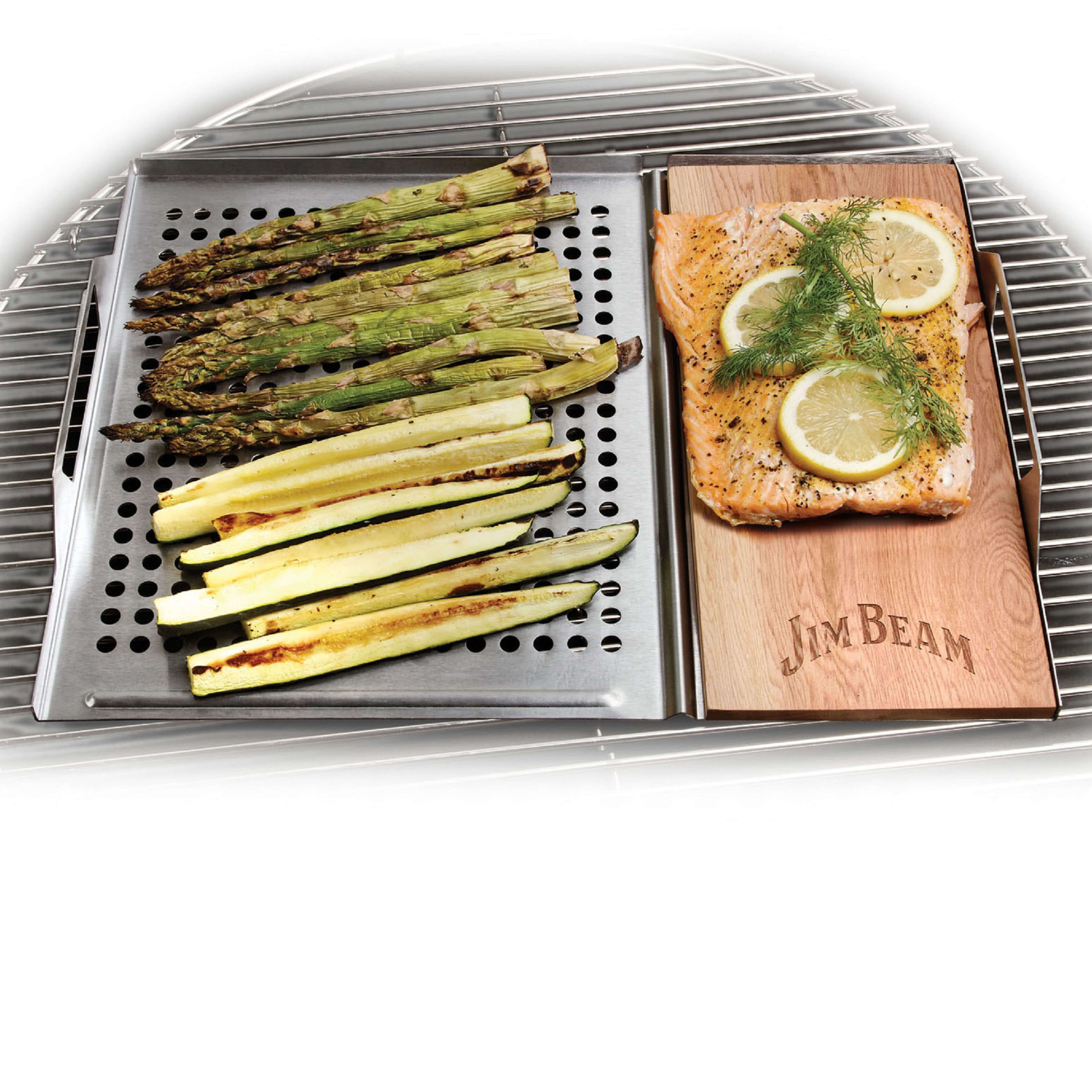 Produktinformationen "Jim Beam BBQ Zubehör Edelstahl-Platte 59x30cm mit Zedernholz, Räucherbrett, perforierte Auflage, besondere Aroma für Grillgut, Fisch, Gemüse, für jede Küche"