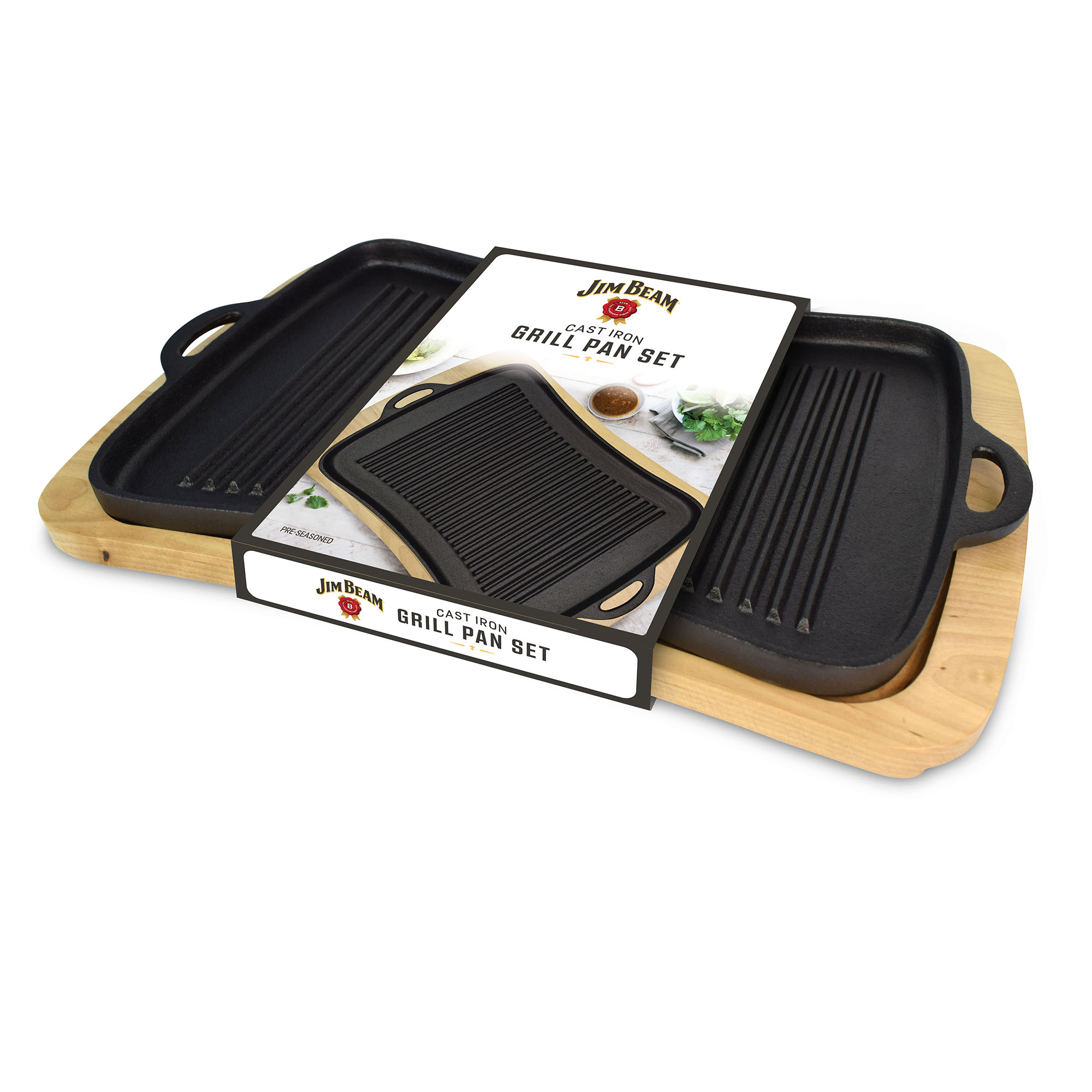 Produktinformationen "Jim Beam BBQ Zubehör Grillplatte aus Gusseisen mit Holzuntersetzer, gerillter Oberfläche, lange Wärmespeicherung, BBQ Braten und Garen, für jede Küche und jeden Grill"