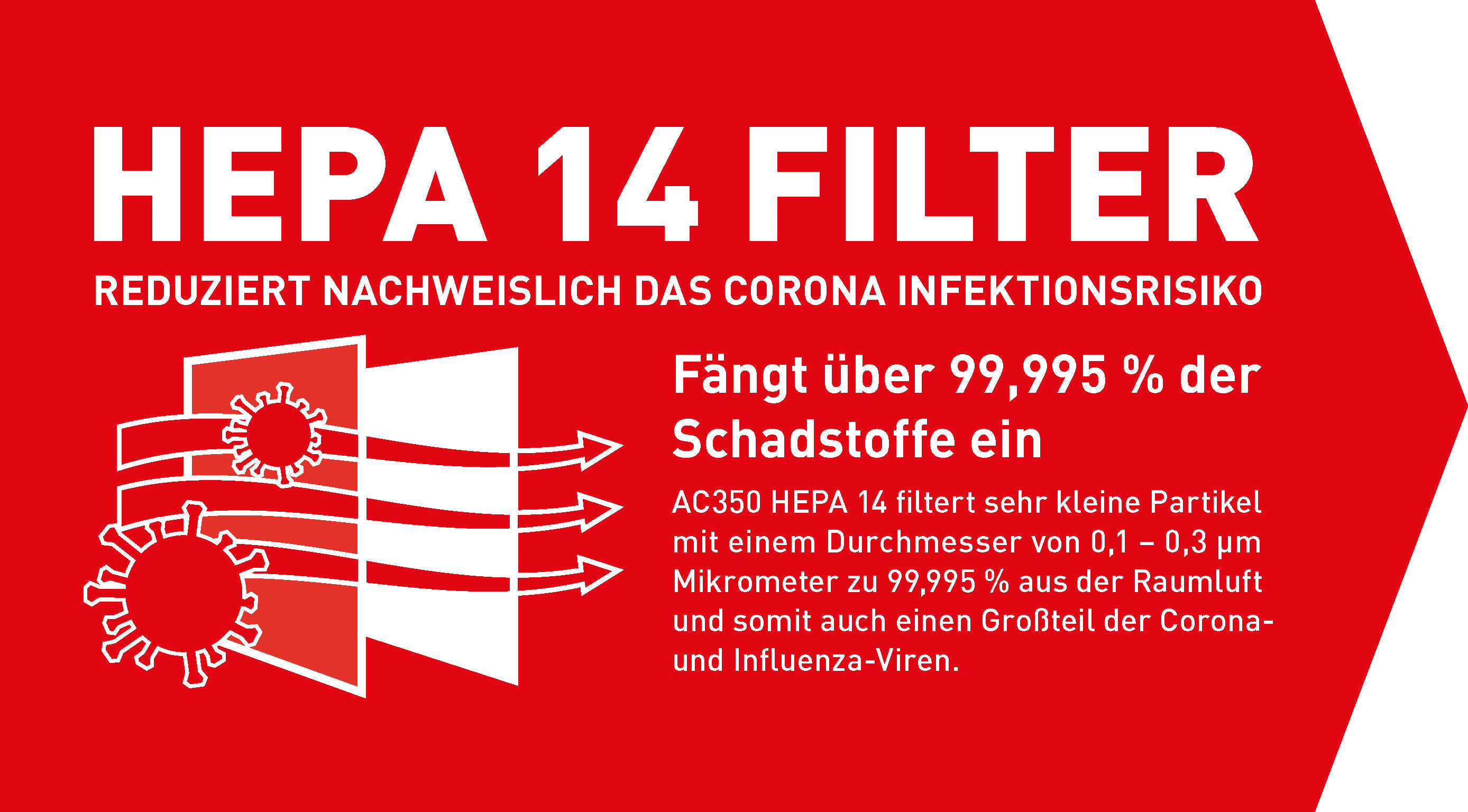 Zusammen sorgen die beiden Filter für eine effektive Reinigung der Luft im Raum. Der Kohlefilter absorbiert Gerüche und Gase, während der HEPA14-Filter Partikel wie Staub, Pollen, Haustierschuppen, Schimmelpilzsporen und mehr aus der Luft filtert.