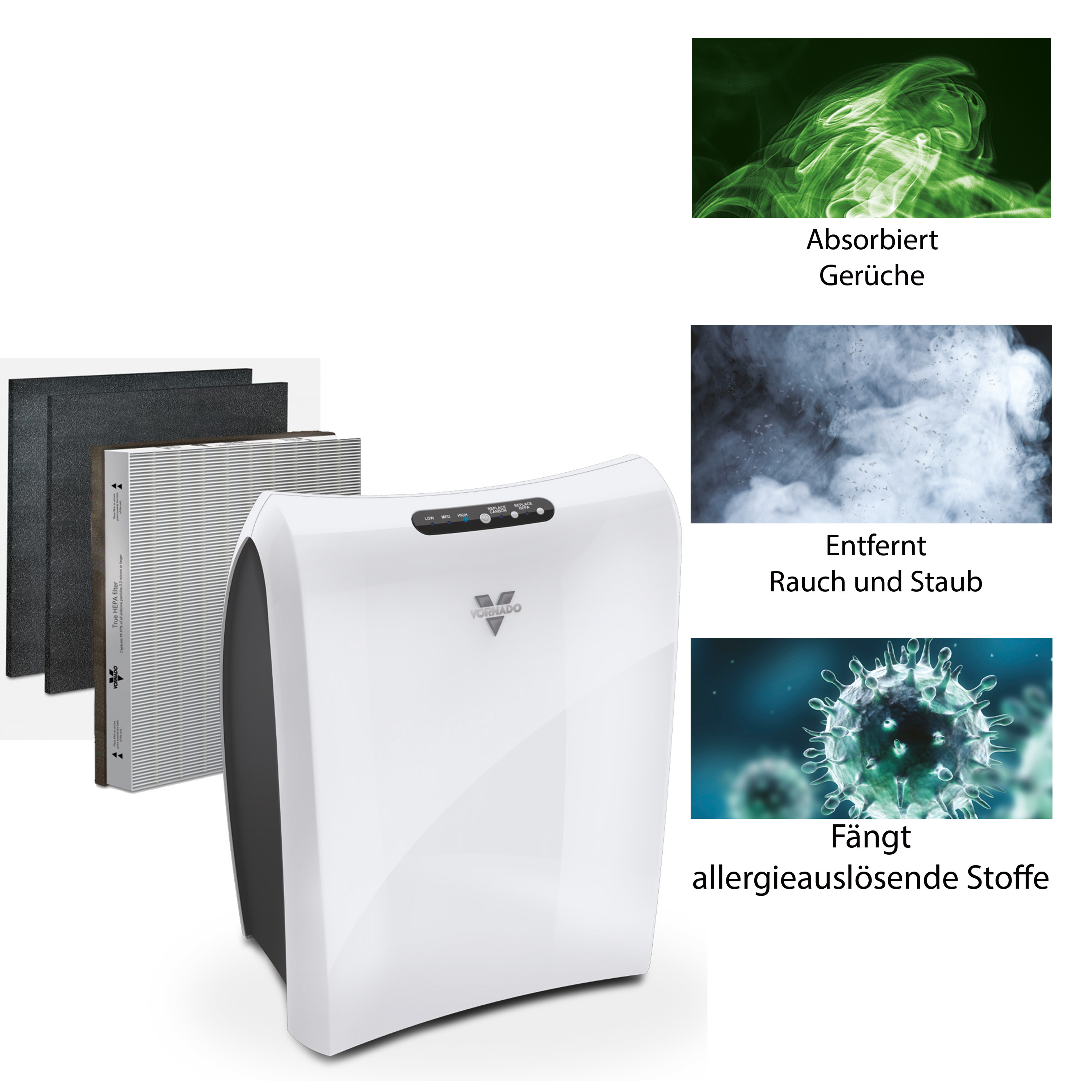 - Filtert im Raum: Staub, Pollen, Haustierschuppen, Rauch, Bakterien, Schimmelpilzsporen, Staubmilben und mehr.